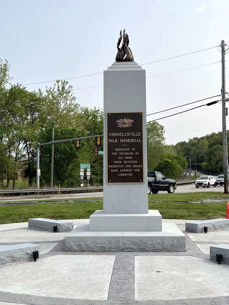 bronze memorial of flame on a pedestal with bronze plaque